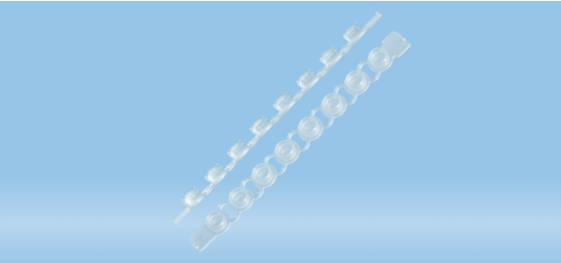 Tampas em tiras para placas PCR (indicados para Placas PCR ref. 72.1979.102/.132, 72.1982.202), feitas em Polipropileno (PP), transparente e com tampa de pressão plana!